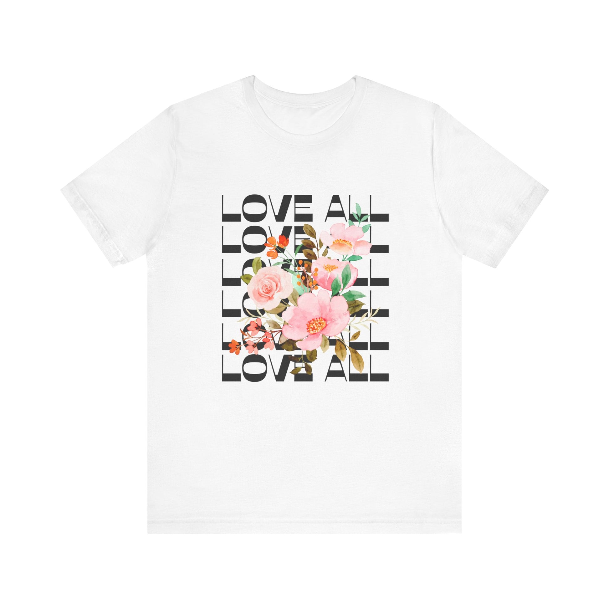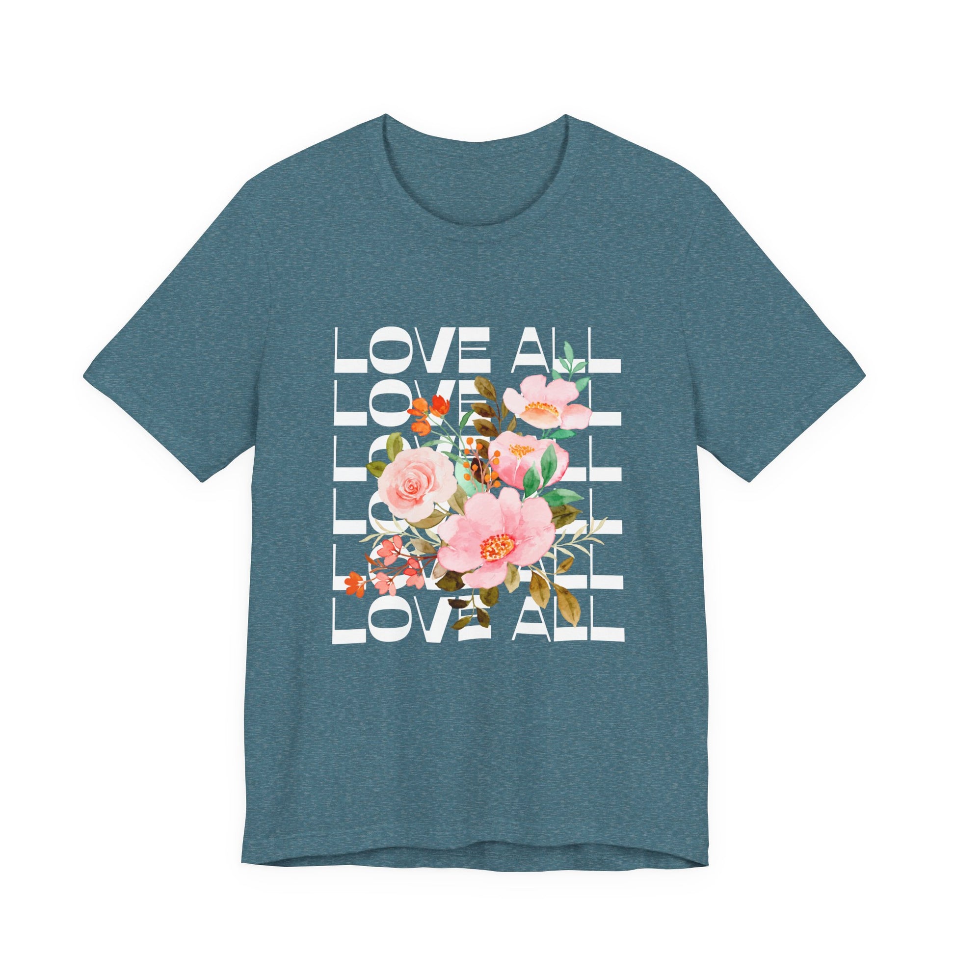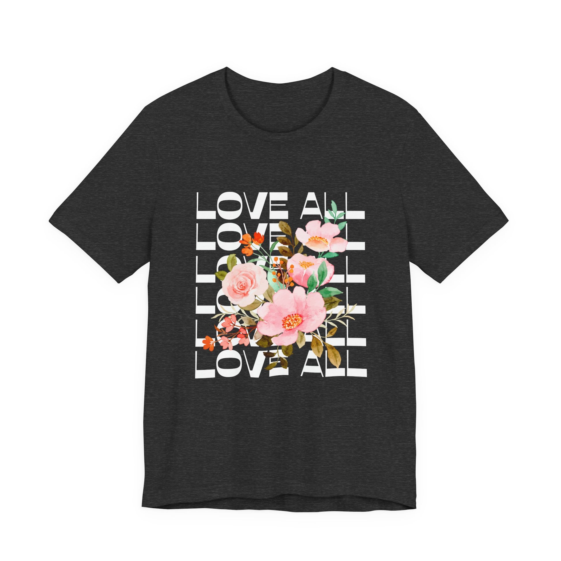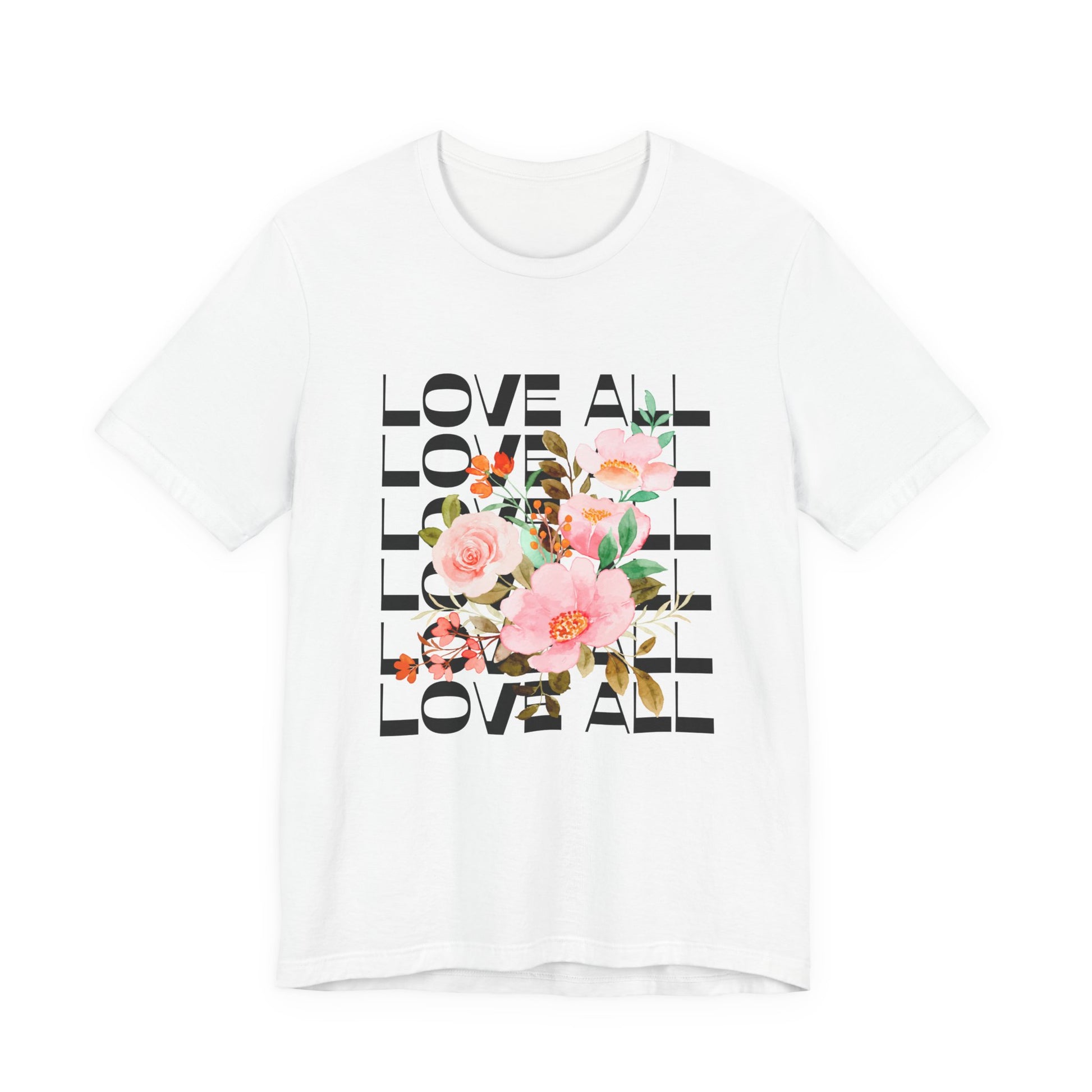 Embrace the spirit of positivity with this unisex jersey short sleeve tee, designed to radiate love and cheer. Featuring a vibrant floral design alongside the uplifting message "LOVE ALL," this shirt serves as a perfect reminder to spread kindness in your daily life. Crafted from 100% Airlume combed and ring-spun cotton, it ensures a comfy fit that’s ideal for lounging at home, casual outings, or gatherings with friends. This tee is perfect for anyone wanting to promote a message of unity and love, making it a great gift for birthdays, anniversaries, or just because! Wear it during celebrations, summer festivals, or cozy gatherings, and let it spark conversations and smiles wherever you go.