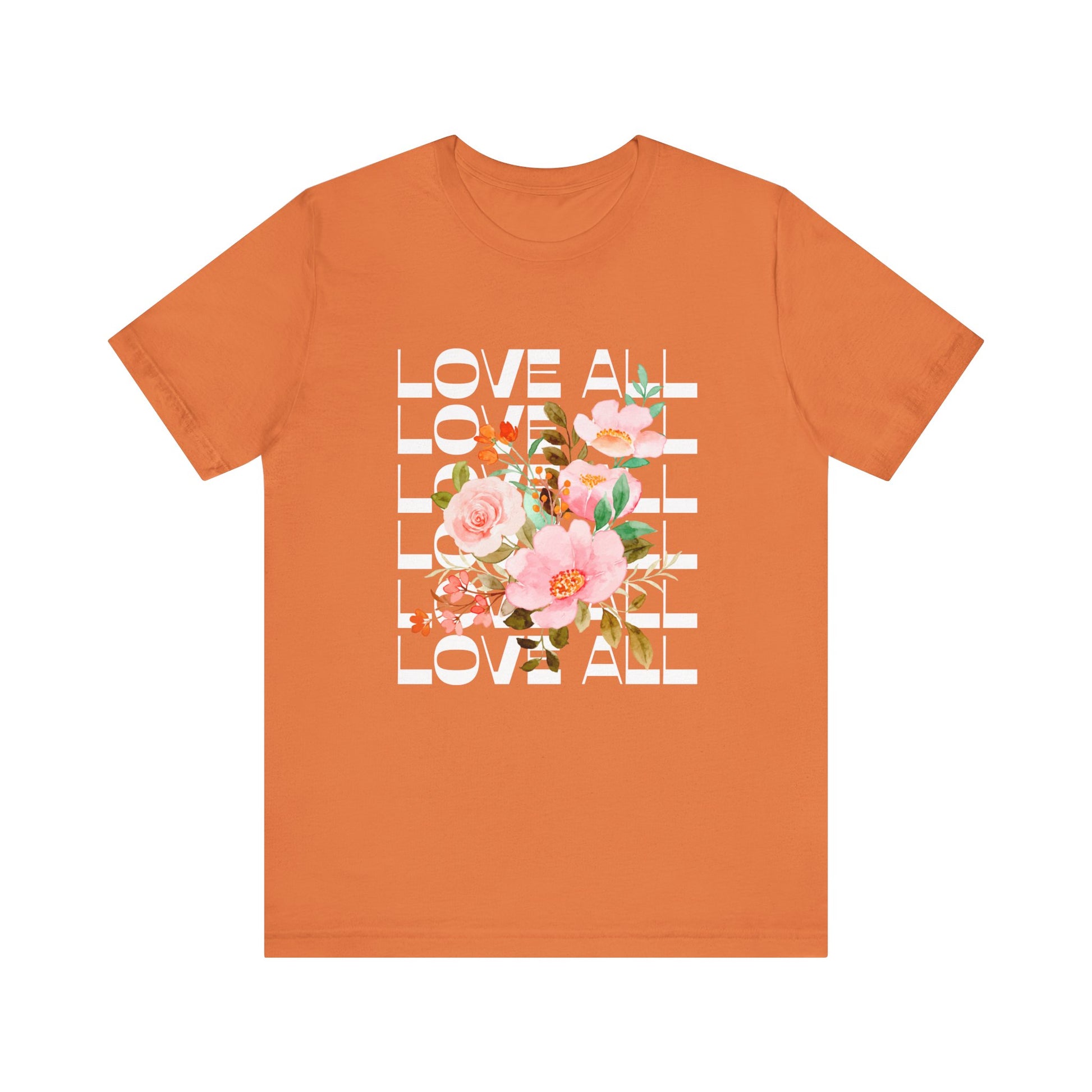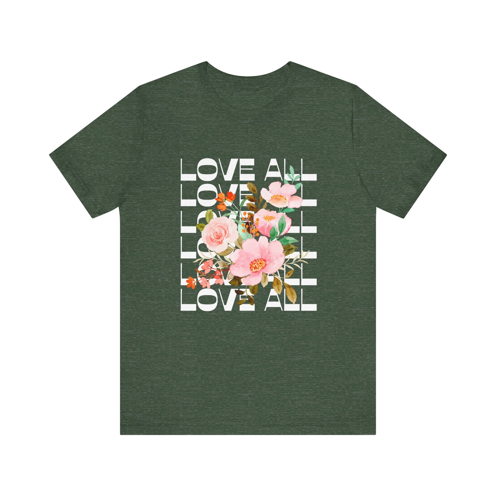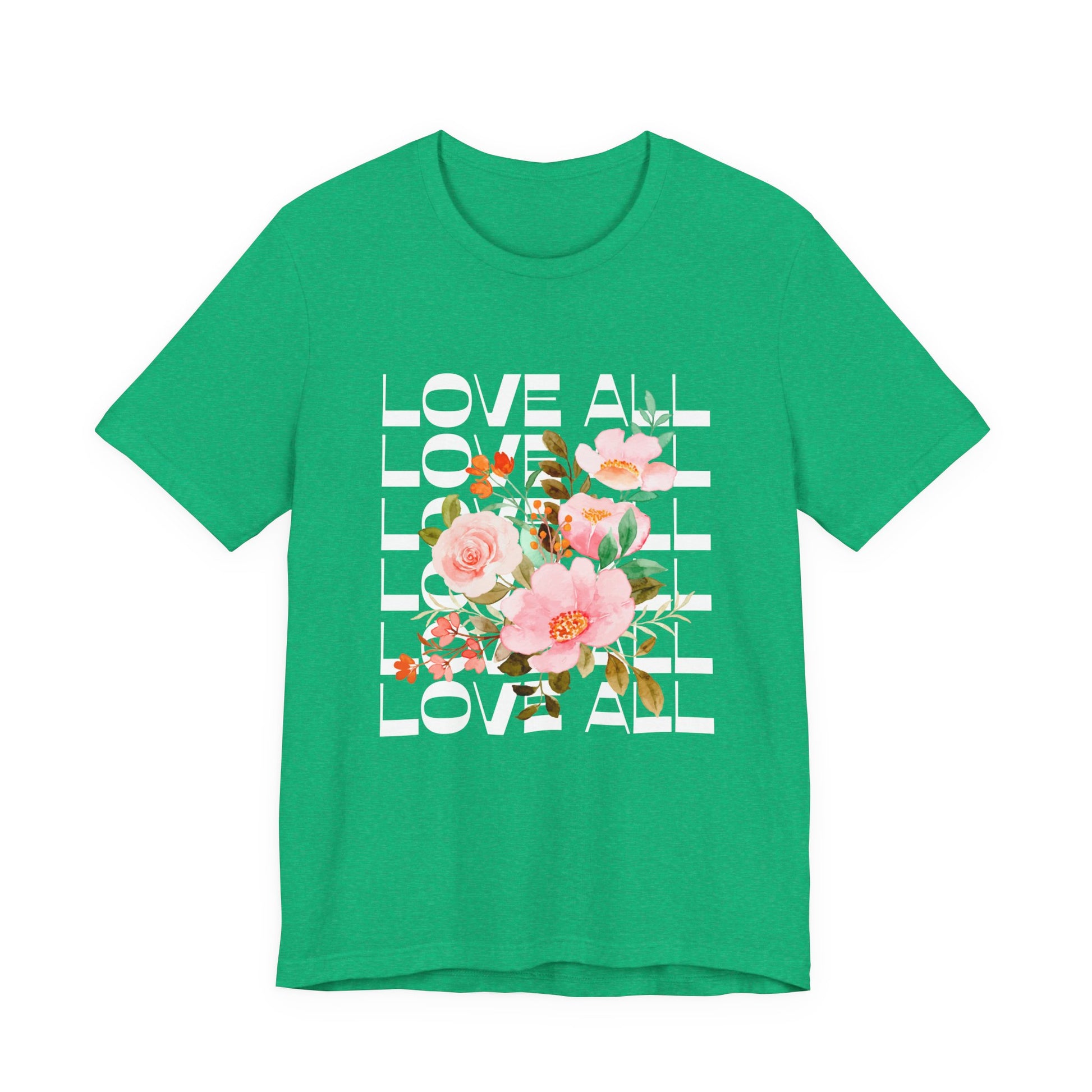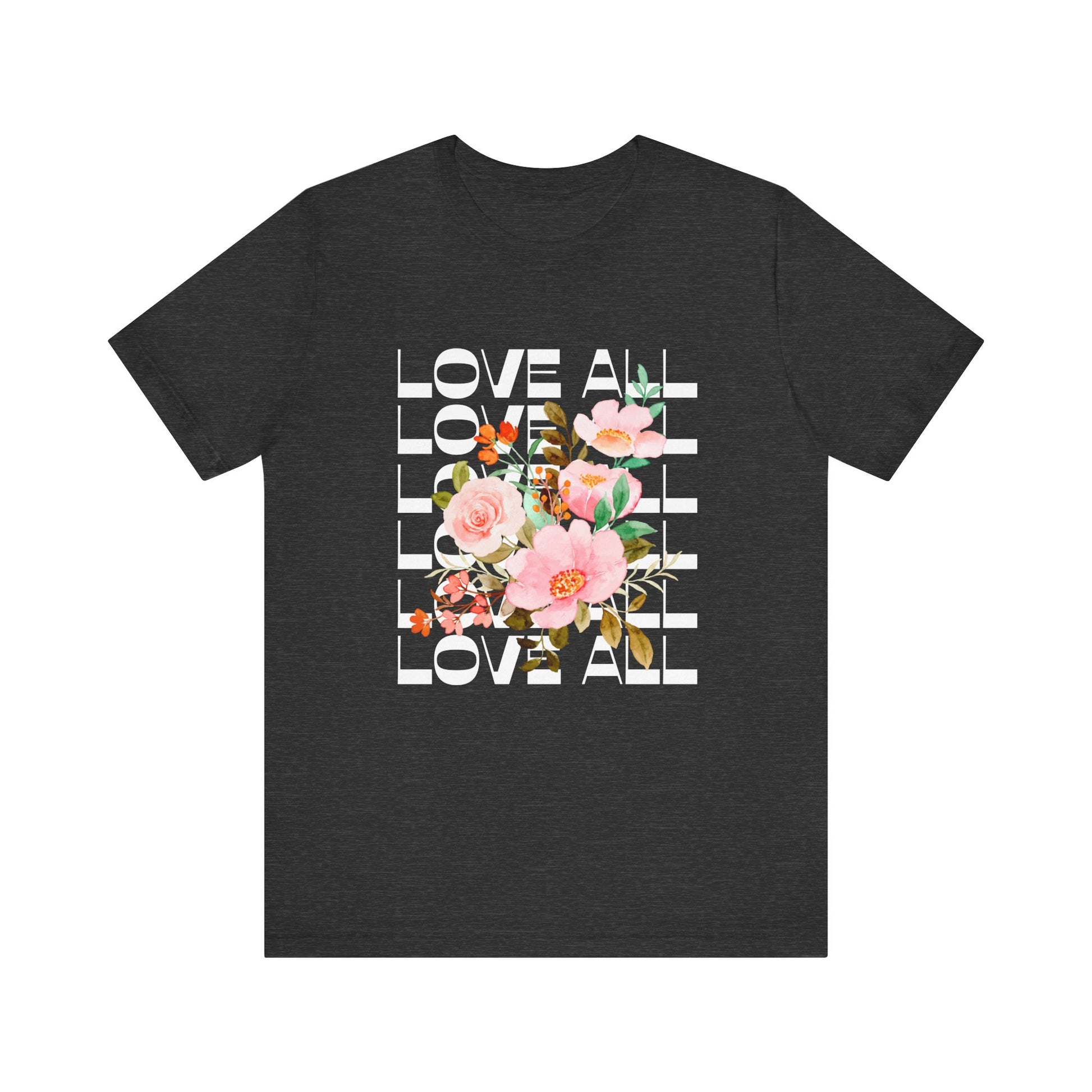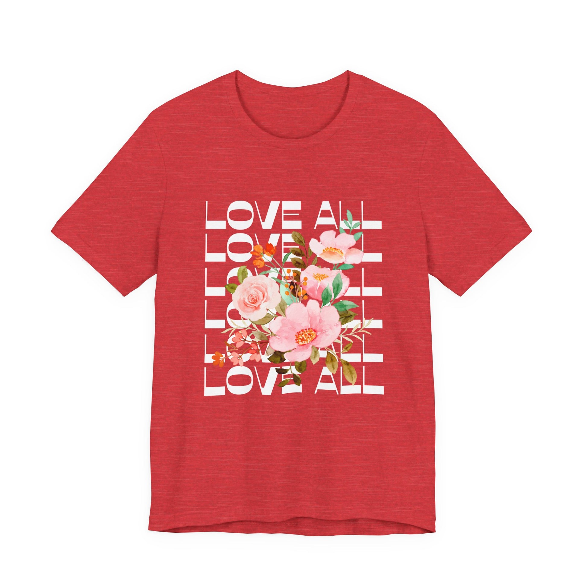 Embrace the spirit of positivity with this unisex jersey short sleeve tee, designed to radiate love and cheer. Featuring a vibrant floral design alongside the uplifting message "LOVE ALL," this shirt serves as a perfect reminder to spread kindness in your daily life. Crafted from 100% Airlume combed and ring-spun cotton, it ensures a comfy fit that’s ideal for lounging at home, casual outings, or gatherings with friends. This tee is perfect for anyone wanting to promote a message of unity and love, making it a great gift for birthdays, anniversaries, or just because! Wear it during celebrations, summer festivals, or cozy gatherings, and let it spark conversations and smiles wherever you go.