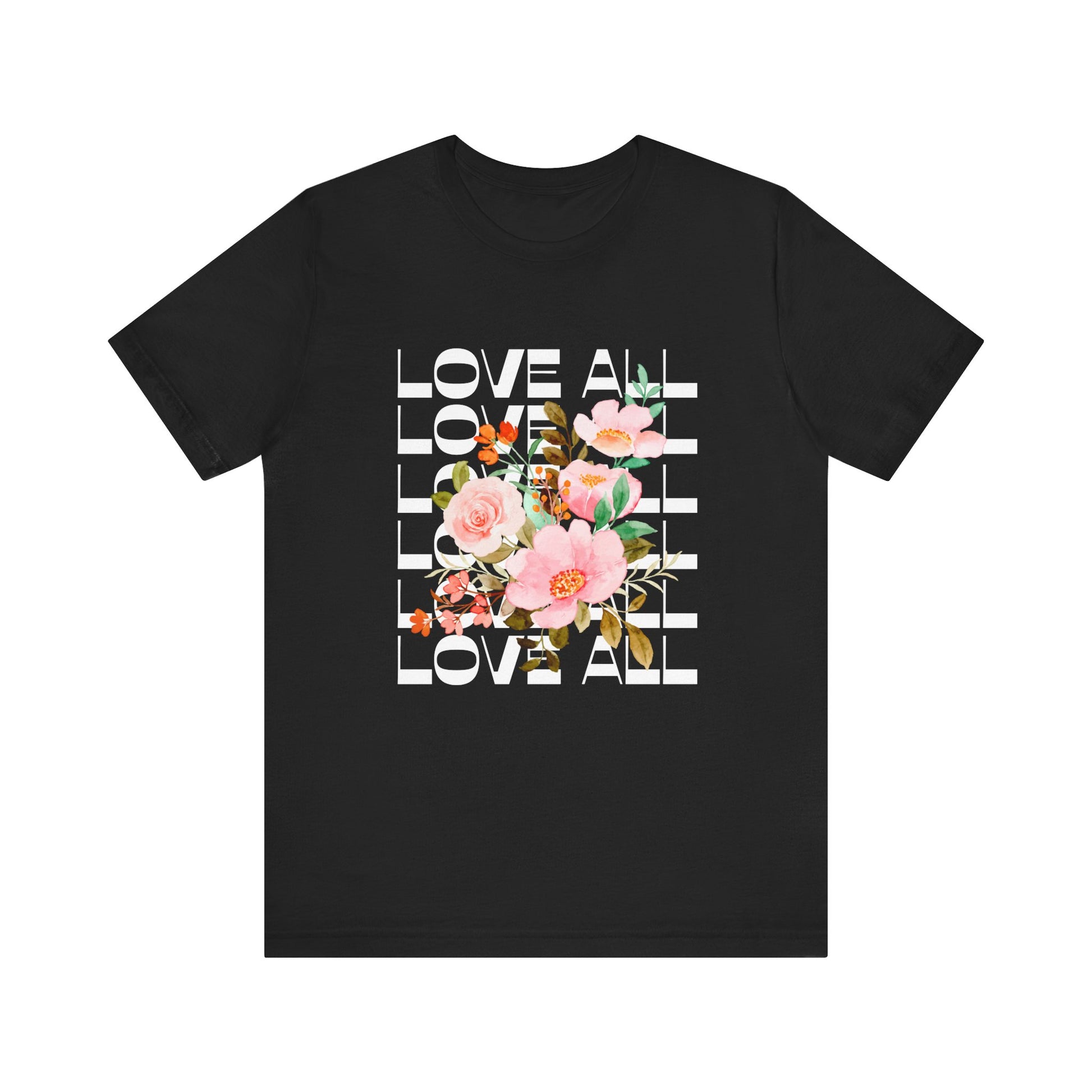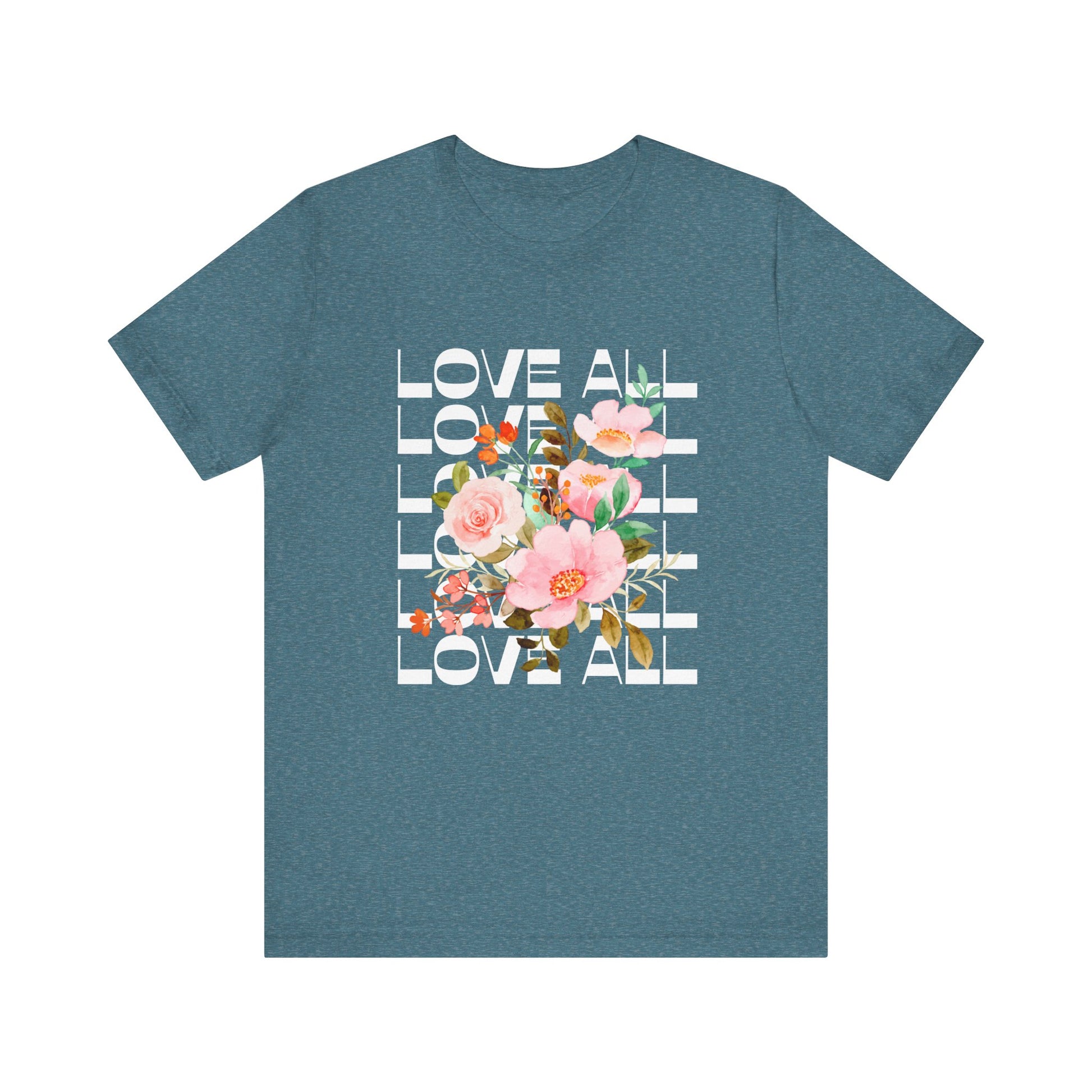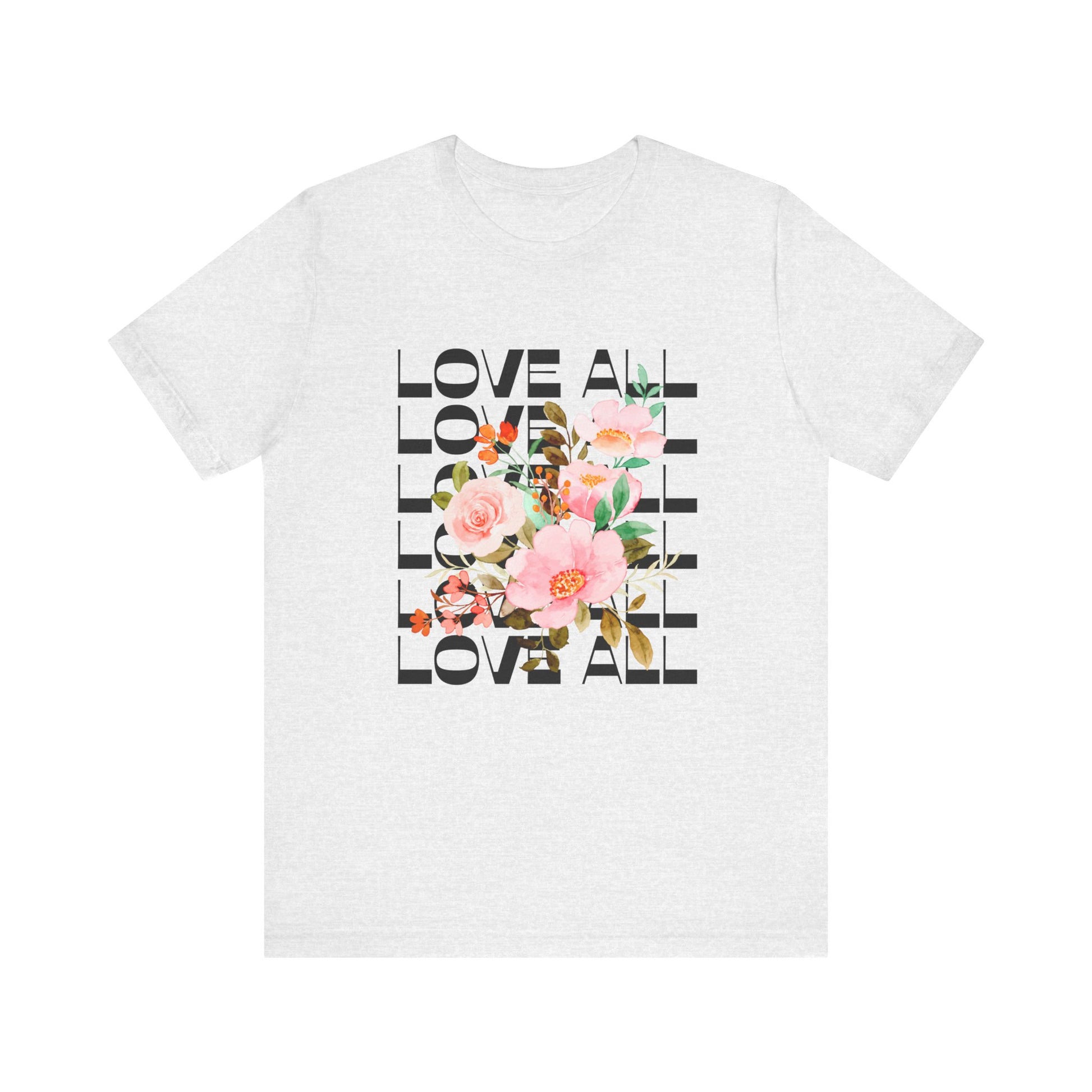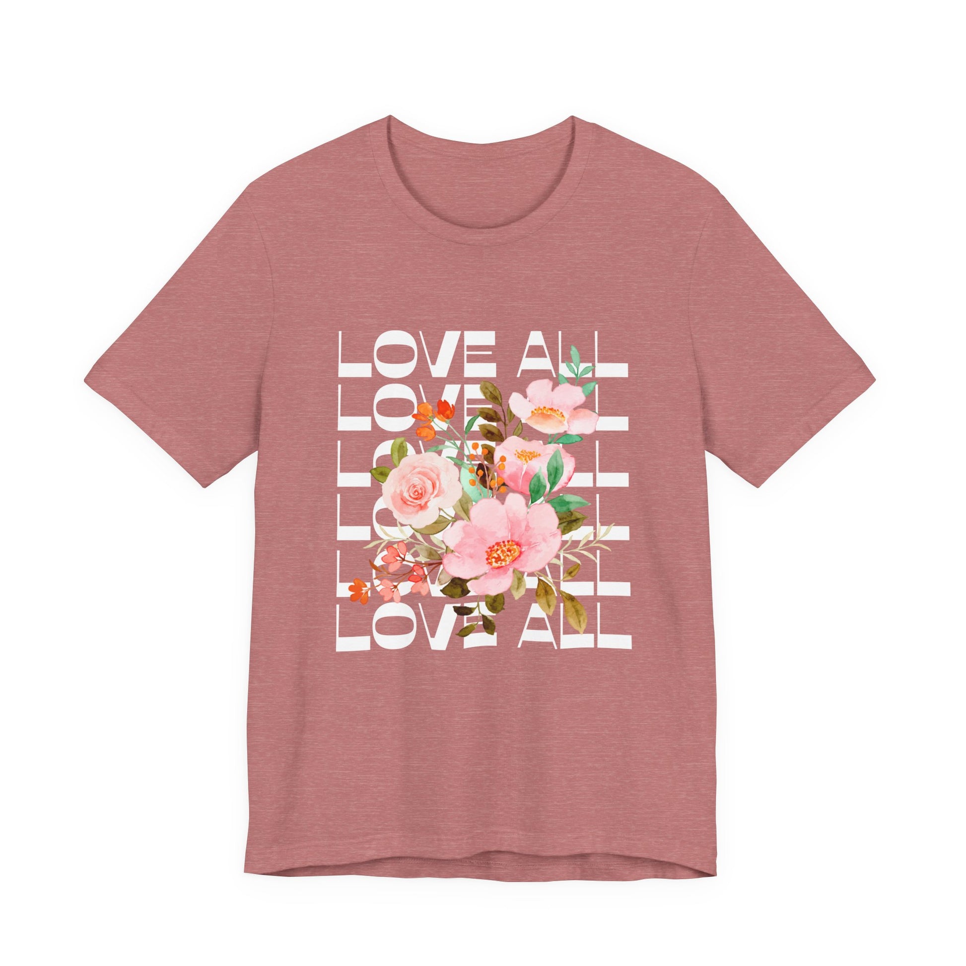 Embrace the spirit of positivity with this unisex jersey short sleeve tee, designed to radiate love and cheer. Featuring a vibrant floral design alongside the uplifting message "LOVE ALL," this shirt serves as a perfect reminder to spread kindness in your daily life. Crafted from 100% Airlume combed and ring-spun cotton, it ensures a comfy fit that’s ideal for lounging at home, casual outings, or gatherings with friends. This tee is perfect for anyone wanting to promote a message of unity and love, making it a great gift for birthdays, anniversaries, or just because! Wear it during celebrations, summer festivals, or cozy gatherings, and let it spark conversations and smiles wherever you go.