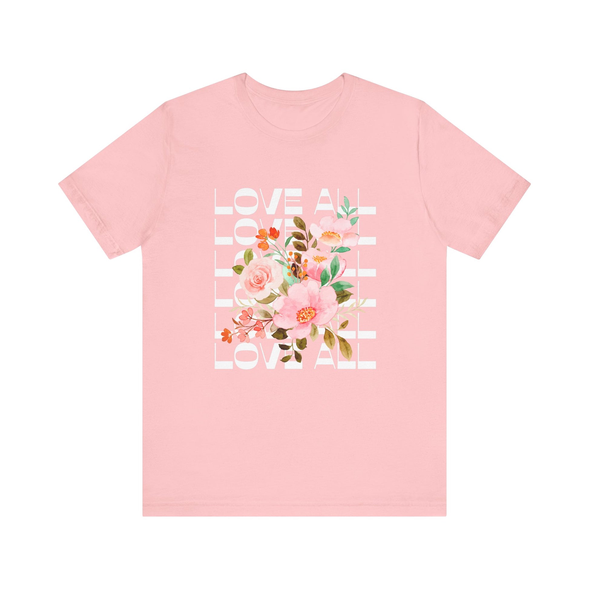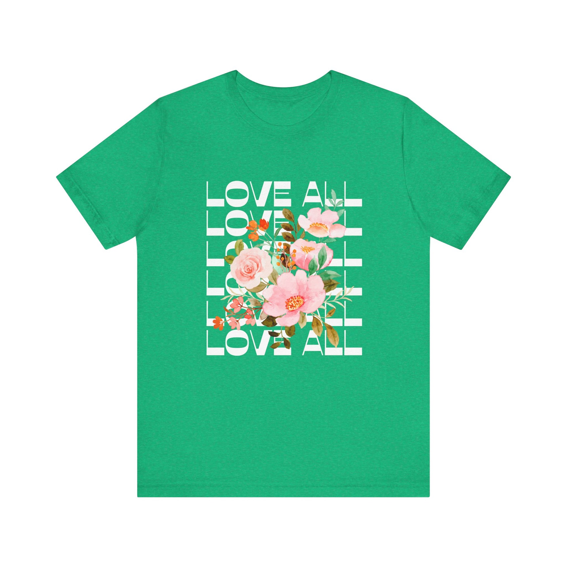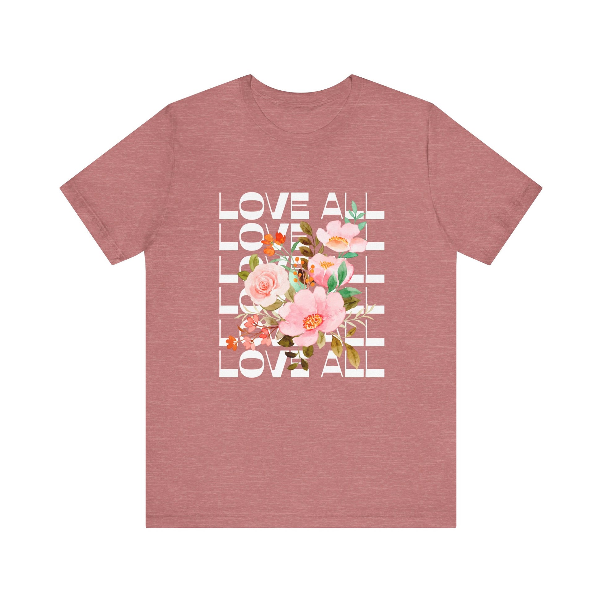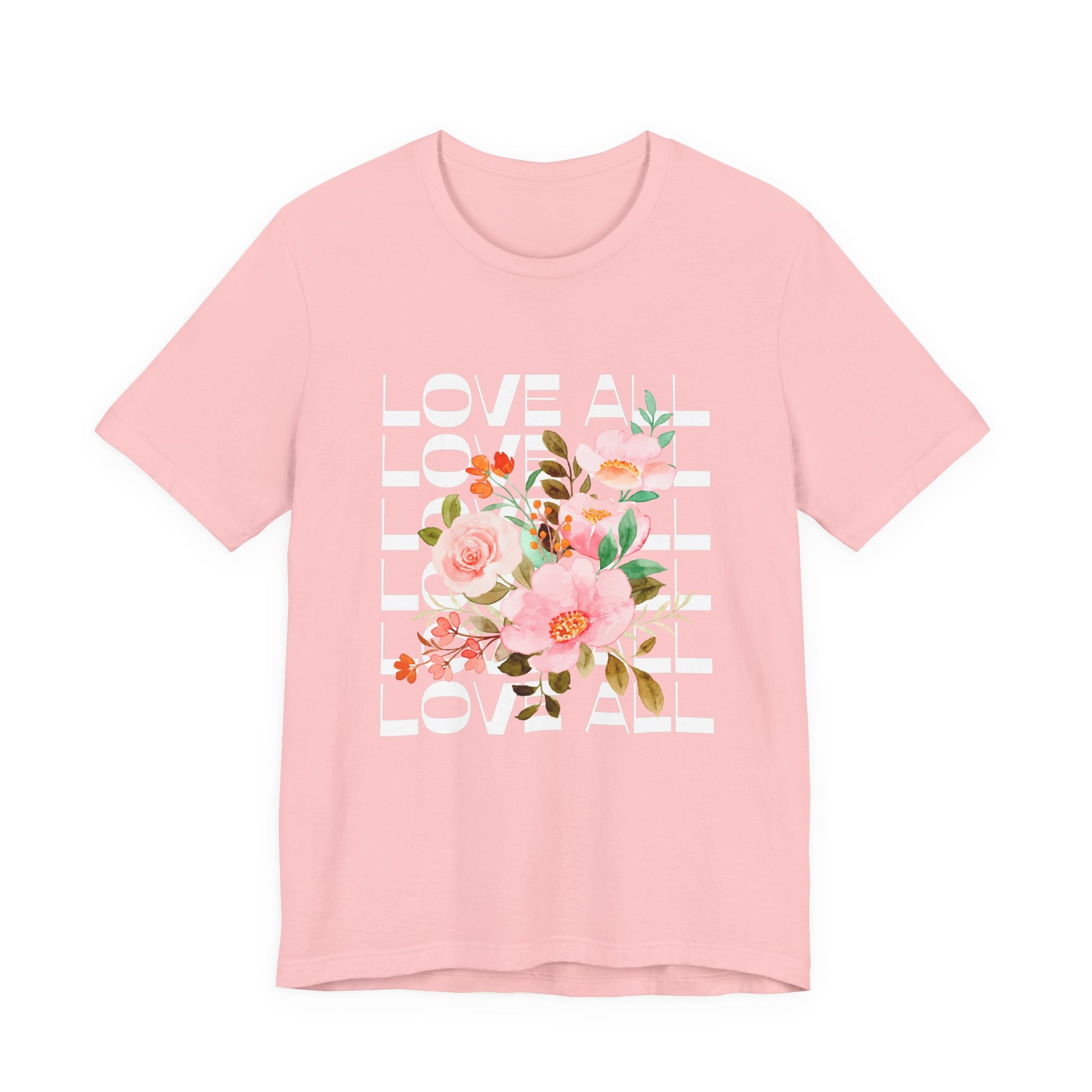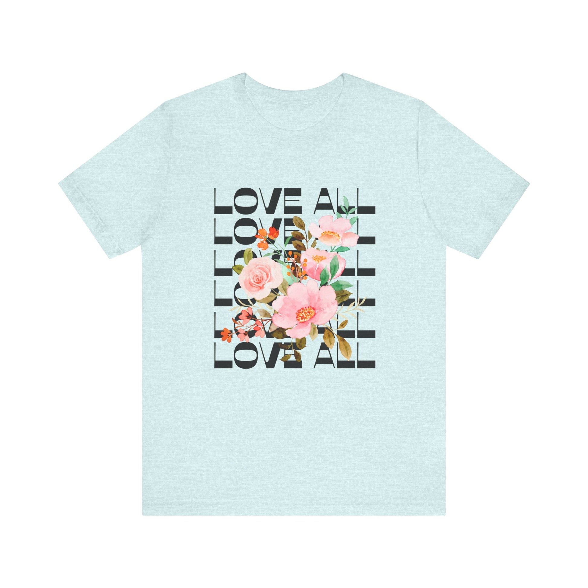 Embrace the spirit of positivity with this unisex jersey short sleeve tee, designed to radiate love and cheer. Featuring a vibrant floral design alongside the uplifting message "LOVE ALL," this shirt serves as a perfect reminder to spread kindness in your daily life. Crafted from 100% Airlume combed and ring-spun cotton, it ensures a comfy fit that’s ideal for lounging at home, casual outings, or gatherings with friends. This tee is perfect for anyone wanting to promote a message of unity and love, making it a great gift for birthdays, anniversaries, or just because! Wear it during celebrations, summer festivals, or cozy gatherings, and let it spark conversations and smiles wherever you go.