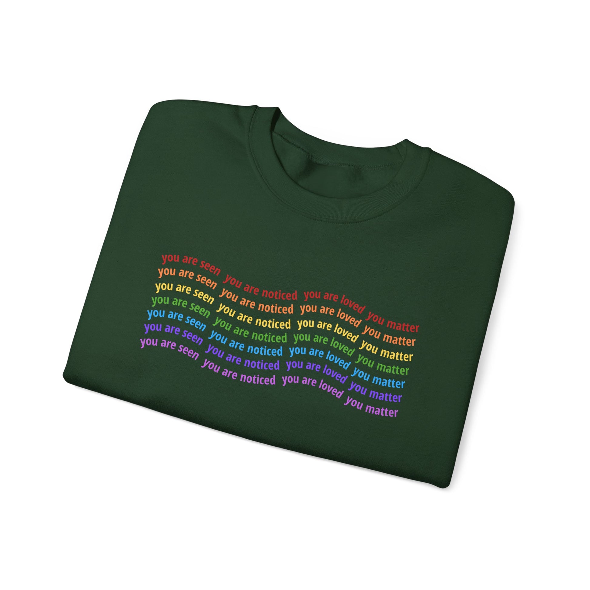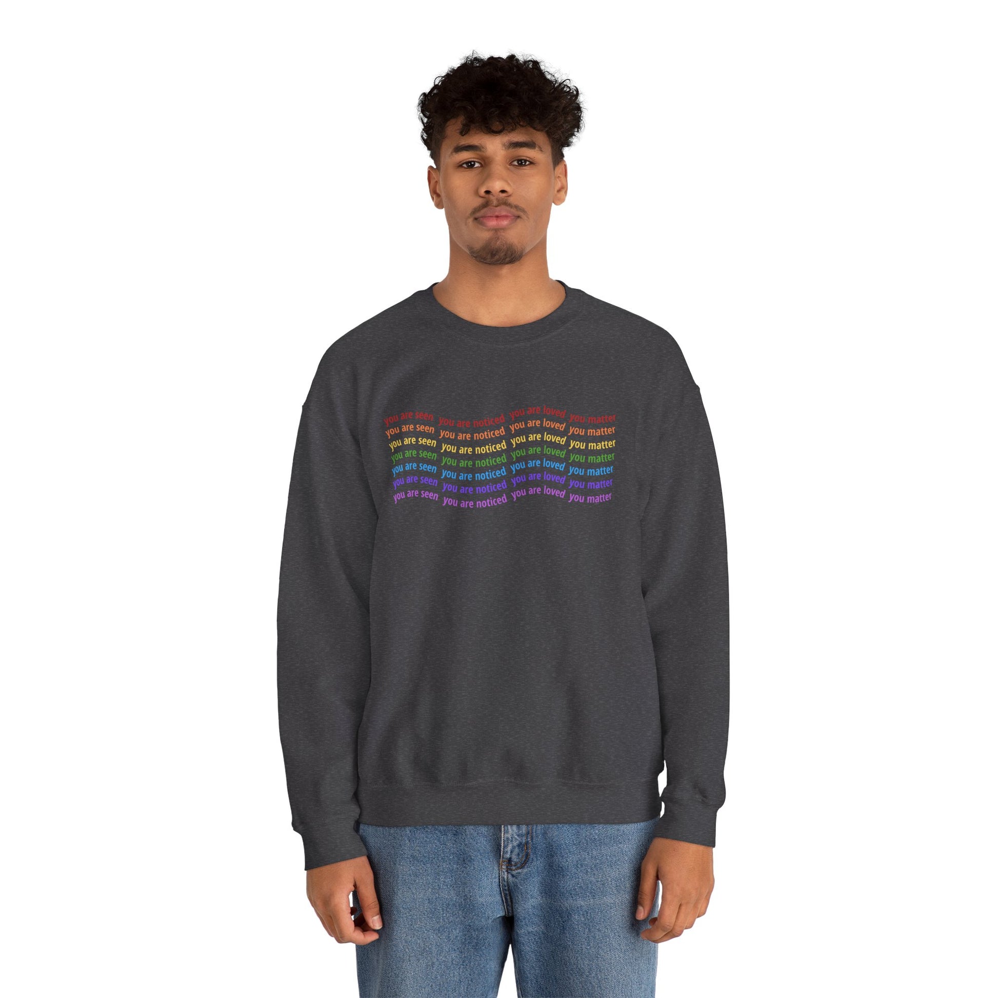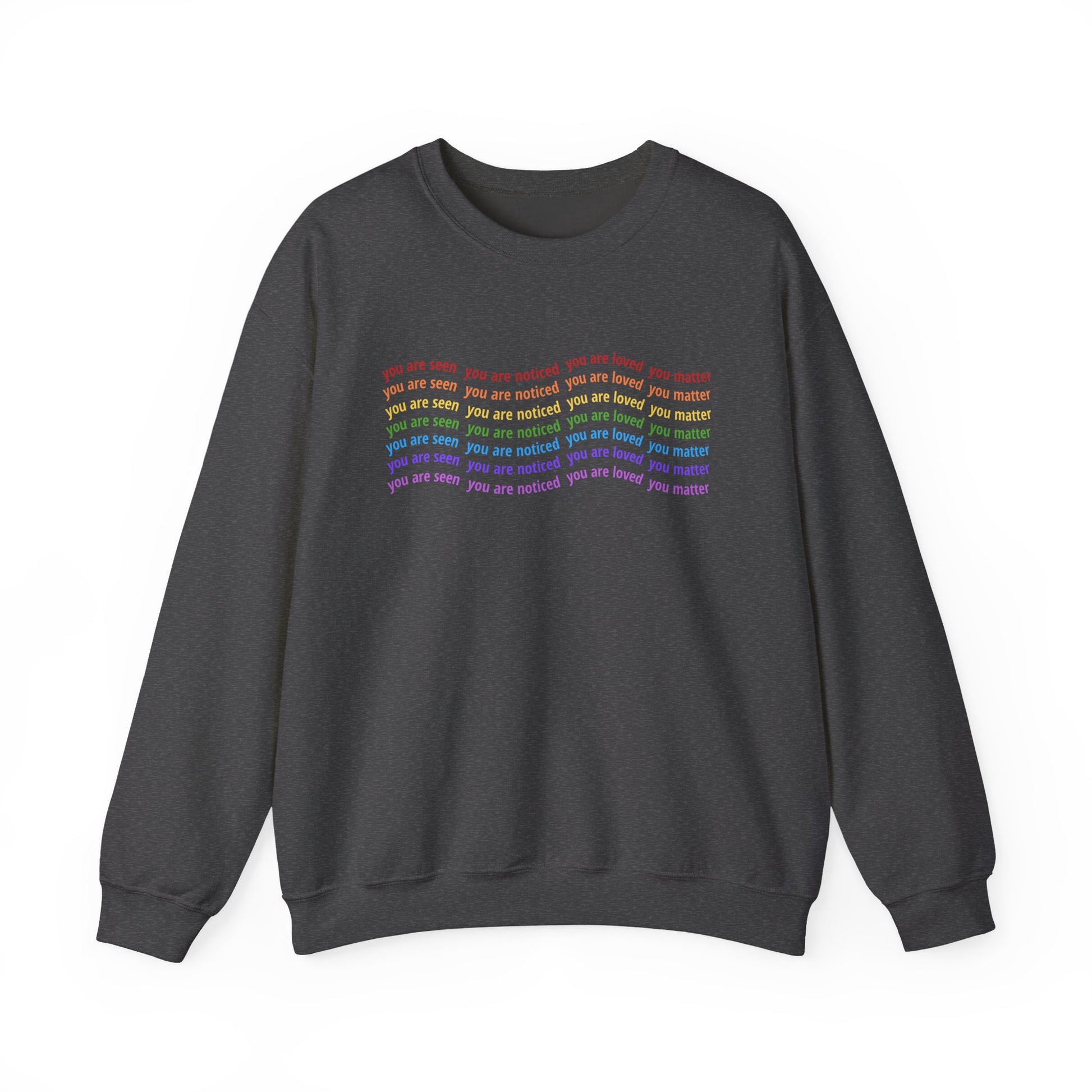 Wrap yourself in affirmation. This cozy crewneck features a wavy rainbow design repeating the words that define your worth: you are seen, you are noticed, you are loved, you matter.