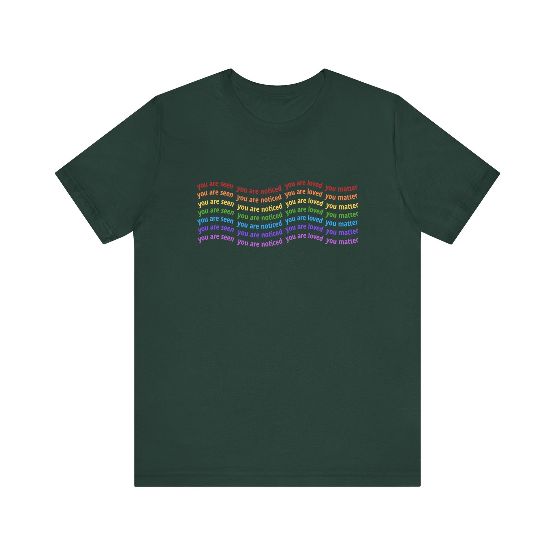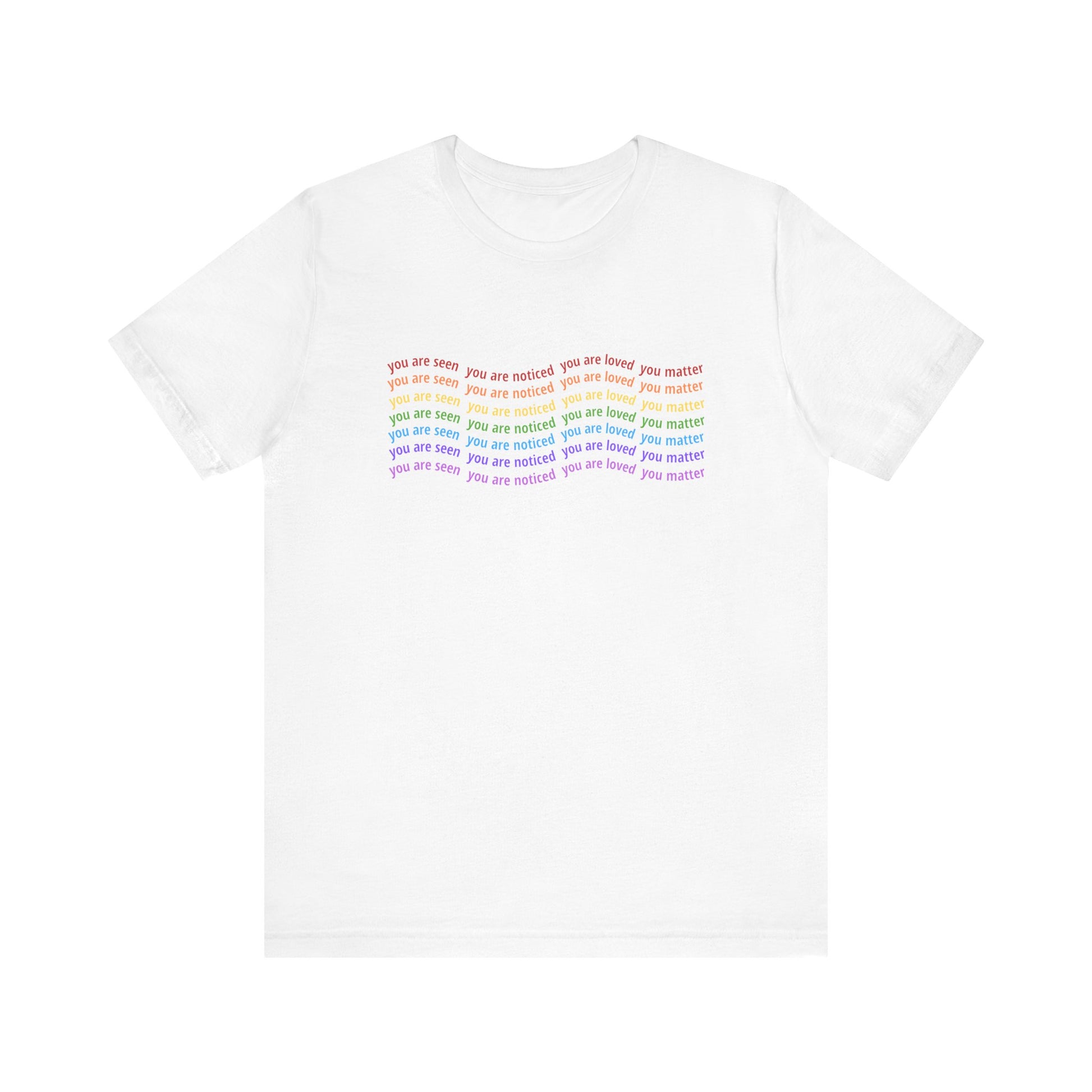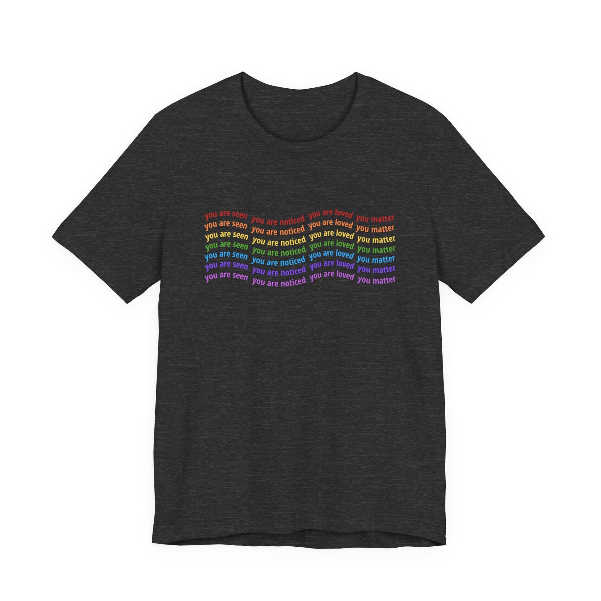 This tee is more than soft fabric — it’s a statement of belonging. The wavy rainbow design repeats the message the world needs most: you are seen, you are noticed, you are loved, you matter.